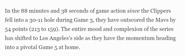 自从快船在第3战11-30落后那一刻起,接下来的88分38秒的比赛,快船轰下213分,而独行侠只得到159分,快船赢了对手54分。如今,胜利的天平正在逐渐向快船一方倾斜。