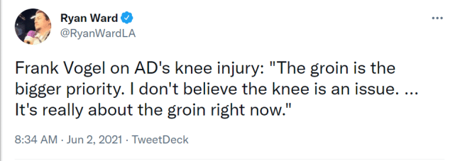 赛前,有记者拍到浓眉进行了投篮热身,但移动非常谨慎,他两次来到场上练习投篮,显然是非常渴望上场。沃格尔谈到浓眉的伤病时说道:“腹股沟是更被关注的伤病,我不认为膝盖是问题。现在真正的问题在腹股沟。”