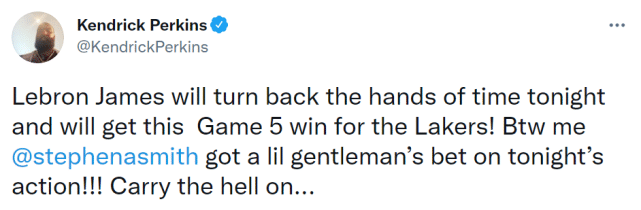 系列赛至今的4场比赛,詹姆斯场均21.8分7.3篮板8.5助攻1.8抢断。前队友帕金斯看好詹姆斯在G5迎来爆发,他写道:“勒布朗-詹姆斯会在今晚让时光倒流,帮助湖人队拿下G5。我还和斯蒂芬-A-史密斯就比赛结果打了个赌!”(注:史密斯认为湖人今晚将输球)