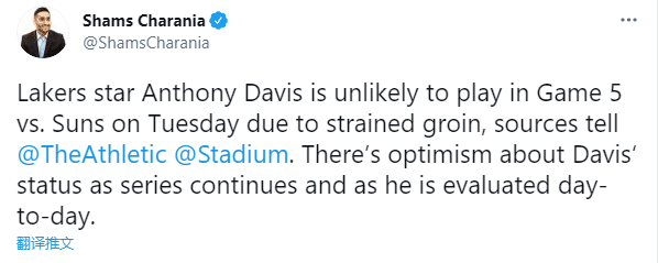 来源:JRS直播网06-01 15:00JRS直播网讯湖人巨星安东尼-戴维斯G5出战状态更新,据名记shams报道,浓眉不太可能出战G5天王山大战,随着系列赛的继续,戴维斯的伤病状态更新为每日观察,目前球队对他的伤势恢复持乐观态度;浓眉腹股沟伤势确诊为一级拉伤,这是最轻级别的。