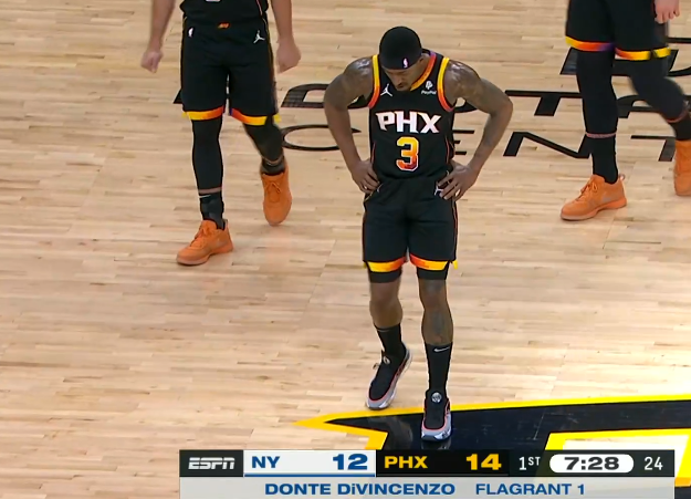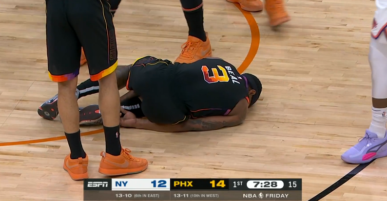 第一节7分28秒,比尔外线迎着防守强投命中三分,落地时踩到迪文琴佐的脚导致自己的脚踝呈现90度扭伤,比尔痛苦倒地十分难受,太阳队医赶紧上场,比尔缓了一段时间后站起来,裁判回放后吹罚迪文琴佐一级恶意犯规,比尔一瘸一拐检查罚球,罚球后离场返回更衣室。