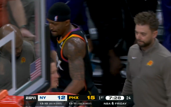 今日对阵尼克斯,太阳三巨头迎来赛季第二次联手,可开场没打5分钟,比尔不幸惨遭90度崴脚,一瘸一拐离场返回更衣室,离场前,比尔上场4分钟,2投2中拿到6分,正负值+3。