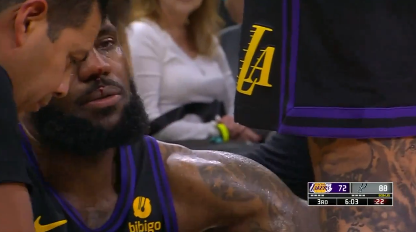 在输给马刺一战,詹姆斯的眼睛被戳了三次且血洒赛场——第二节被科林斯插眼,痛苦倒地并下场接受检查;之后詹姆斯的左眼被文班亚马打了一下;下半场第三节,詹姆斯被队友八村垒一巴掌打到眼睛和鼻子,鼻子被打出血,血染赛场,全场拿到23分14助攻7篮板仍无缘带队逆转。
