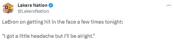 赛后谈到多次被打到面部,詹姆斯表示:我有点头疼,但我会没事的。