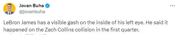 据湖人记者Jovan Buha报道,詹姆斯的左眼内侧有一道明显的伤口,这是被科林斯弄伤的,该伤口位于靠近他鼻子的内侧和左眼内侧;值得一提的是,科林斯防守插眼并未吃到恶意犯规,裁判仅吹罚普通犯规。
