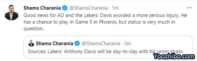 在报道中,SHAMS表示浓眉哥已经被湖人队列入媒体观察名单,他的G5属于出战成疑状态,这意味着什么呢?SHAMES表示,浓眉哥避免了更严重的伤病,他不会因为伤病错过整轮的系列赛,更加重要的是浓眉哥依旧有可能在G5登场,虽然机率只有一半,但这对于湖人来说无疑是最大的利好。