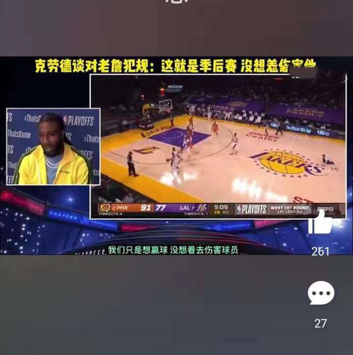 在赛后的采访中,克劳德的回应更是火上浇油,当记者询问,有很多人认为太阳队以及克劳德打球脏的时候,克拉的洋洋得意的回忆,我们只是防守强硬,我们想赢球,不想伤害别人。