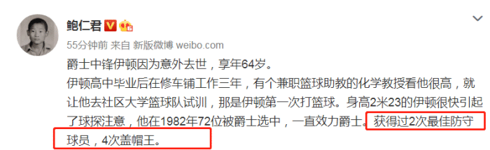 据NBA名记Shams报道,爵士名宿伊顿去世,今年64岁。而国内记者鲍仁君也报道了该消息,据悉,伊顿是遭遇车祸意外去世。