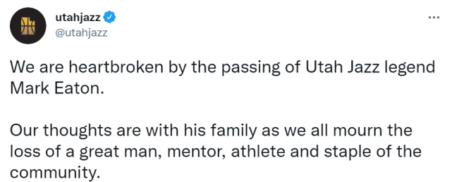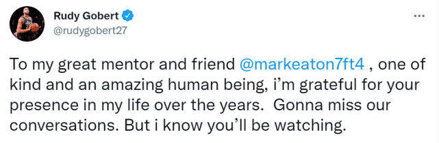 伊顿是爵士中锋戈贝尔的良师益友。听闻伊顿突然去世的消息,戈贝尔在社媒上贴出了自己和伊顿的两张合影,并写道:“致我伟大的导师和朋友马克-伊顿:一个善良了不起的人,我很感激这些年你出现在我的生命中。我会想念我们之间的谈话,我知道你会在天上继续关注我们。”
