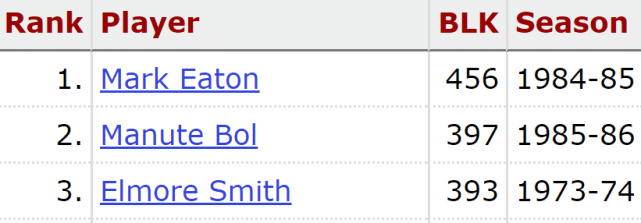 伊顿的外号是“猛犸象”,他的两项纪录至今无人可破。第一项是单赛季盖帽总数纪录,伊顿在1984-85赛季曾单赛季盖帽456次,位居历史第一,排名历史第二的是曼纽特-波尔的397次,还是有挺大的差距。
