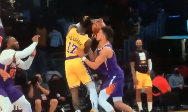 在比赛最后时候,落后的太阳队仍然无法限制对手得分,布克在一次防守湖人球队施罗德突破进攻时候,将高高跃起的施罗德拦腰推飞,后者重重摔在地板上并打滚2圈。而布克因此吃到了个人第六次犯规,裁判回放将犯规升级为二级恶意犯规,前者随即被驱逐出场。