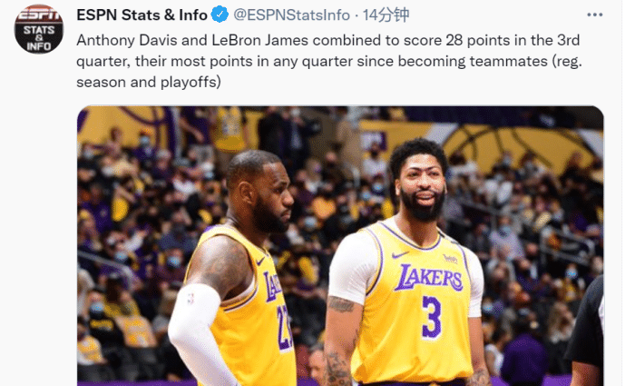 不过中场休息后,詹姆斯突然爆发,连续的攻筐造杀伤,并且上演了一记精彩的单手劈扣!浓眉哥也进入了神挡杀神的模式!太阳禁区被无情蹂躏!单节詹姆斯砍下10分,戴维斯独得18分,两大巨星单节合砍28分!据ESPN统计,这创造了詹眉联手以来两人单节总得分新高!
