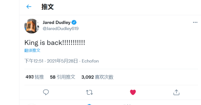 赛后,队友杜德利也是第一时间发推:皇帝回来了!是的,虽然太阳1比2落后还没有落入到绝境,但结合詹姆斯状态的回升以及保罗的伤病,太阳要想扭转局势难度太大!一旦湖人再拿下第4场,这轮系列赛的悬念应该会很快终结!