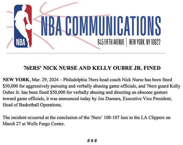 来源:JRS直播网03-30 16:06JRS直播网讯 北京时间3月30日,NBA官方公布罚单,官方声明,76人主教练纳斯因主动顶撞并言语辱骂裁判被罚款5万美元,76人后卫乌布雷因言语辱骂裁判并作出冒犯性手势也被罚款5万美元。