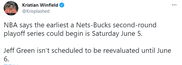 东部第二篮网2-0凯尔特人、雄鹿3-0热火——若首轮在5场内打完,下一轮将在6月6日开打;若打到第六场或者第七场,下一轮将在6月8日开打;(西部湖人2-1太阳和掘金2-1开拓者,半决赛对阵情况也是如此)