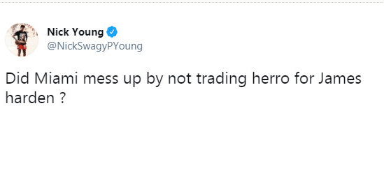 比赛结束之后,已经逐渐淡出NBA的尼克杨在社交媒体上点评,称:“热火这赛季是不是因为拒绝用希罗交易哈登而搞砸的?”