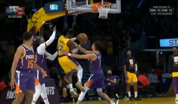 比赛最后时刻,还剩35秒湖人103-93领先10分,布克输急了眼,突然在防守时推飞施罗德,小黑倒地翻滚好几圈,布克空中推人动作太脏,当时裁判第一时间冲过来,以防湖人球员找布克要说法;布克吃到个人第六次犯规从而下场,裁判回放这一幕,把这个犯规升级为二级恶意犯规,布克被直接驱逐离场。
