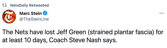 篮网队方面,他们2比0领先凯尔特人,优势还是比较明显,不过内线重要轮换球员杰夫-格林受伤了。纳什透露,格林遭到足底筋膜拉伤的伤势,这种情况下,他将至少缺席十天的时间,然后再进行检查。格林对篮网的内线还是非常重要,尤其是等到了下一个系列赛,他会是重要的选择,期待早日康复。
