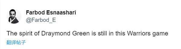 对于保罗恶犯撞倒泰斯,快船记者Farbod Esnaashari发推吐槽:追梦格林的精神依旧回荡在勇士比赛。