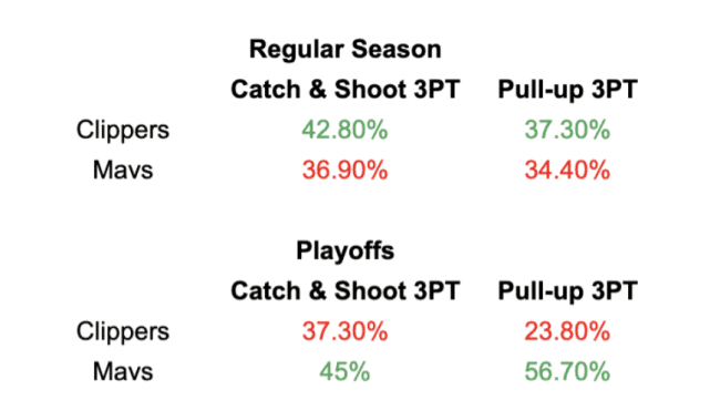 独行侠一方,常规赛接球即射的三分命中率36.9%,持球干拔的三分命中率34.4%,而到了季后赛,两项命中率分别提升至45%和56.7%。此消彼长,也难怪快船要0-2落后了。