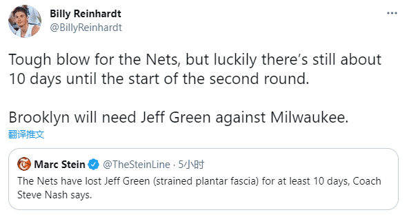 来源:JRS直播网05-28 10:04JRS直播网讯 北京时间5月28日,篮网系列赛2-0领先却传来坏消息,34岁悍将杰夫-格林遭遇伤病,伤情确诊为足底筋膜拉伤,至少伤停10天,这意味着格林将缺席首轮剩下的所有比赛;格林将随队出征客场,并且接受康复治疗。