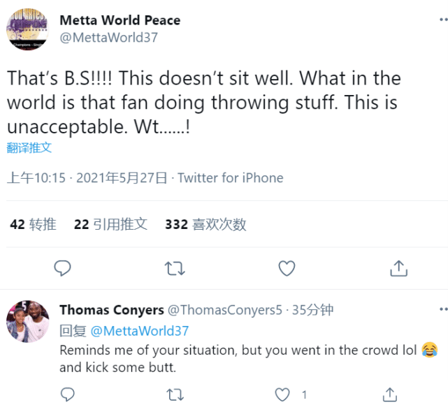 在事件发生后,曾经制造了奥本山宫殿事件的阿泰斯特率先站出来声援了威少,阿泰斯特表示,这真的是太扯了,这是让人坐立不安的行为,球迷怎么能够如此,向NBA球员乱扔东西是不可理解和不可接受的。