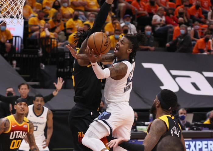 两队第一场较量,灰熊112-109爆冷击溃爵士,布鲁克斯轰下31分7篮板,莫兰特26分,原本米切尔计划上场但被队医叫停,他也非常愤怒。第二场对决,米切尔复出,带队7人上双,康利轰下20分15助攻,莫兰特空砍47分7助攻,爵士141-129完胜灰熊,将总比分扳成1-1平!