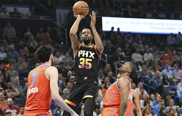 下半场,第三节太阳开场4-14进攻糟糕并且瞬间落后到21分,太阳大比分落后,布克早早吃到第5次犯规从而无奈下场,在这样的情况下,杜兰特连中三分助太阳反扑,可KD单节6中3独砍13分仍无济于事,三节打完太阳仍落后21分。