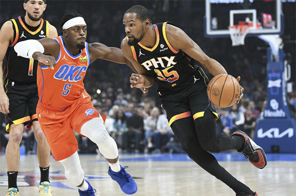 本赛季第三次对阵雷霆,第一节太阳和雷霆展开对攻大战,不过第二节太阳火力下滑而且防不住对手,半场打完太阳59-70落后11分;杜兰特半场9中6拿到11分,布克12分和比尔11分,太阳三巨头都是半场得分上双,无奈球队落后两位数。
