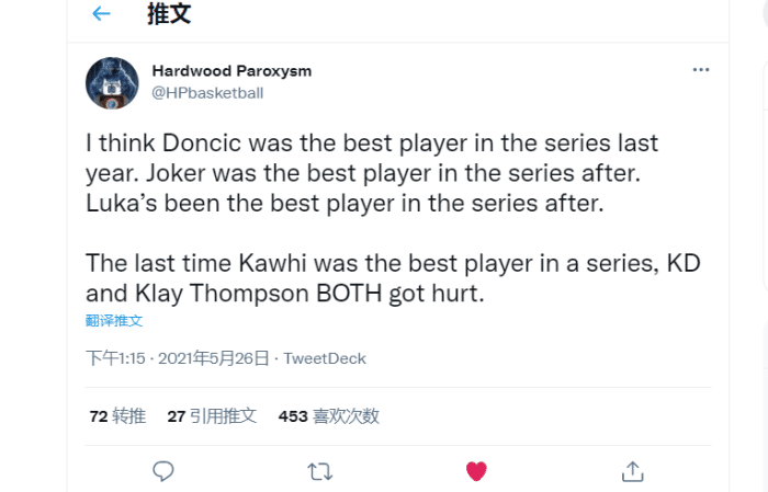 名记Hardwood Paroxysm调侃小卡:去年季后赛,东契奇就是快船独行侠两队表现最好的球员。而西部半决赛快船打掘金,约基奇是系列赛最好的球员。今年快船独行侠打到现在,东契奇还是两队最好的球员!小卡上一次在系列赛中成为最好的球员还得是2019年总决赛杜兰特、汤普森都受伤的情况下。