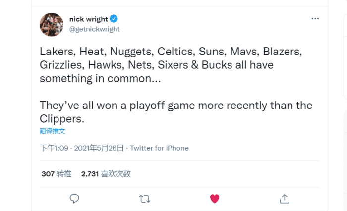 名记nick wright的吐槽更扎心:湖人、热火、掘金、凯尔特人、太阳、独行侠、开拓者、灰熊、老鹰、篮网、76人、雄鹿都有一个共同点,去年快船3比1领先掘金后,这些球队都在季后赛赢过球,而快船没有。