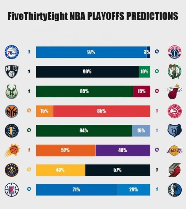 除了以上12队外,另外4队的胜负差并不大:掘金43%vs开拓者57%,太阳52%vs湖人48%。从美媒的分析数据来看,他们看衰了奇、凯、热、尼、灰、独这6队,同时也把76人、篮、雄、老、快、爵这6豪强整成了晋级热门,而开、掘、太、湖4队基本属于半斤八两的对手,但湖人、掘金不被看好。客观来说,这次“Five Thirty Eight”的分析大致比较客观,因为按球队在常规赛所表现出的战斗力与本身实力来看,这样的概率比基本也算在情理之中。不过湖人、灰熊2队却有望打脸美媒。