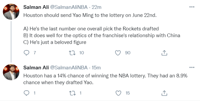 来源:JRS直播网05-25 10:13JRS直播网讯2021年的NBA选秀抽签仪式,将在北京时间6月23日举行。火箭记者Salman Ali建议球队请姚明出马,希望这位昔日的状元秀能为火箭带回一支状元签。