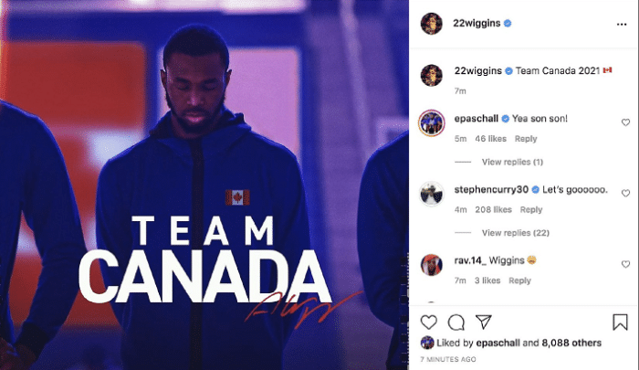 维金斯是加拿大球员,也是NBA历史上第一位加拿大出生得分超过10000分的球员,值得一提的是纳什也是加拿大人,但出生地不在加拿大。维金斯更新社交媒体,他晒出了一张自己身着加拿大球衣赛前的照片,同时配文“2021年加拿大队”。