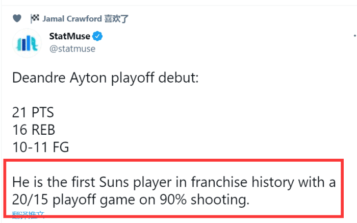 而据美媒statmuse统计,艾顿还成为太阳队史第一位在季后赛以至少90%的投篮命中率砍下20+15的球员!作为湖人防守最强的内线,艾顿打疯浓眉哥难咎其责,不但没有防住艾顿,自己进攻端还被艾顿死死限制!