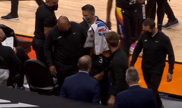 保罗心情沮丧,用毛巾捂着头,因伤被迫离场并且返回更衣室接受检查,随后保罗重返替补席;受伤下场前,保罗首发上场10分钟2投1中拿到3分4篮板你5助攻1抢断,他是太阳队的核心指挥官,意外受伤离场,所幸36岁保罗伤无大碍,又重返赛场。
