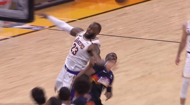相比比赛的结果,比赛中的几个小插曲,完美地抢镜了比赛,我们先来看看香蕉船兄弟之间的相爱相杀。比赛来到第四节,詹姆斯走上罚球线,罚球不中后,詹姆斯准备冲抢篮板此时卡在他身前的保罗用了一个“夹胳膊”的动作把詹姆斯放到在地上,随后詹姆斯痛苦的捂着自己的肩部。