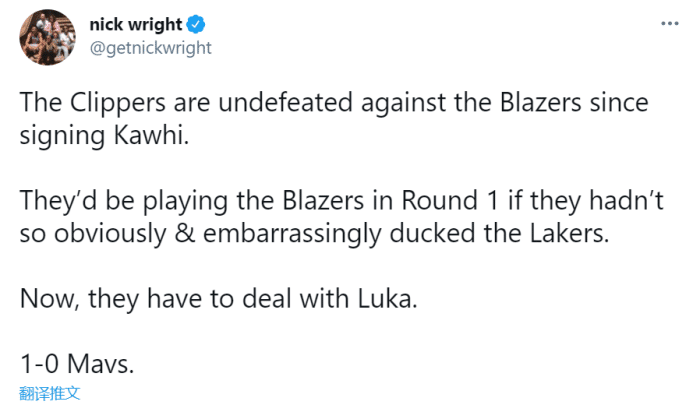 名记nick wright:自签下伦纳德后,快船没有输过开拓者,如果他们没有那么明显想方设法避开湖人,他们本会在第一轮面对开拓者,现在他们不得不对付东契奇,让独行侠1比0了。
