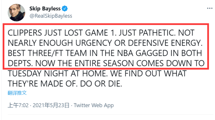 系列赛很漫长,虽然快船只不过才输了一场,但仍有不少美媒认为这是不应该的。名记skip bayless发推:快船输掉G1太可悲了,没有足够的紧迫感,防守端也缺少能量。常规赛最好的三分和罚球大队在这两个方面都表现不佳,G2将是快船本赛季最重要的一场比赛,决一死战!