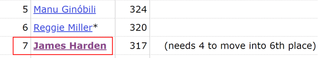 哈登的季后赛生涯三分命中数已经来到317个,排名历史第7位,他只需要再投进4个三分球,就能超越雷吉-米勒(320个),升至历史第6位。而排在季后赛三分榜前5位的球员依次是库里(470个)、詹姆斯(414个)、雷-阿伦(385个)、克莱-汤普森(374个)和吉诺比利(324个)。哈登超越米勒后,也将很快超越吉诺比利。本赛季,哈登打了44场常规赛,15场比赛至少投中4个三分球。