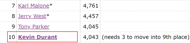 杜兰特的季后赛生涯总得分已经达到4043分,排名季后赛历史第10位,他只需要再得到3分,就可以超越托尼-帕克(4045分),升至历史第9位。接下来,他的超越目标将是湖人名宿杰里-韦斯特(4457分)。杜兰特在季后赛往往火力十足,生涯场均能轰下29.1分,预计对绿军首战中很快就能超越帕克。