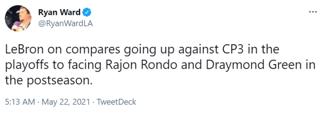 这也是詹姆斯和保罗这对好兄弟第一次在季后赛里交手。谈到保罗时,詹姆斯说:“对抗克里斯-保罗就像跟拉简-朗多、德雷蒙德-格林这样的人交手一样,他们都是智商极高的球员。”