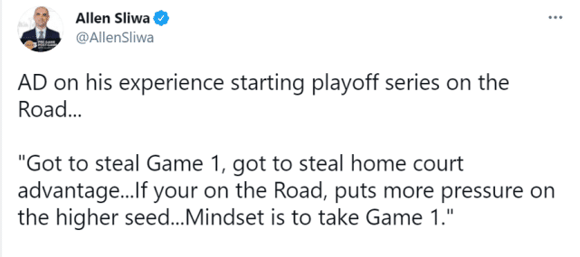 作为7号种子,湖人将从客场开始季后赛之旅。谈到这方面的经验,浓眉说:“必须偷下第一场,拿回主场优势,如果你从客场开始比赛,就得让对手承受更大的压力。目标是拿下第一场。”