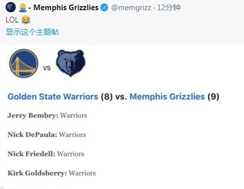 灰熊这边是非常开心的,在赛前16名专家预测的时候,只有1名专家预测灰熊可以晋级,剩下的15人都不看好灰熊。不过很显然灰熊实力打脸。灰熊官推转发了此前专家们对该场附加赛的预测数据,并写道:“笑哭。”