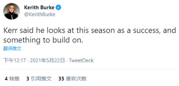 比赛结束之后,勇士主帅科尔接受采访,他认为这个赛季是成功的,对于勇士不能打季后赛感到失望,对球队的未来感到非常期待。