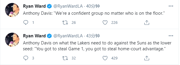 浓眉也表示太阳的中距离投篮是湖人的一大挑战,因为湖人的挡拆战术就是迫使对手进行中投,这正是太阳想要的;浓眉还说湖人队必须从防守做起,我们必须拿下第一场比赛,必须抢到主场优势。