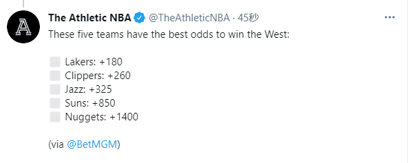湖人首轮以西部第七的身份对阵西部第二的太阳,詹姆斯和浓眉带队导演黑七奇迹吗?很有可能,目前西部冠军最新赔率显示,湖人力压快船、爵士等队是西部冠军的头号热门,这意味湖人将一黑到底,直接黑到总决赛。