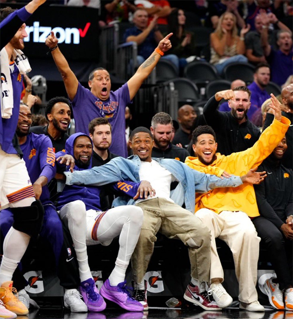 本赛季太阳已经打了23场比赛,可杜兰特、比尔和布克总是因至少一位球星受伤而无缘合体,上一场太阳击败勇士,比尔伤愈复出,但杜兰特因伤休战,全程在替补席为队友加油打气;如今,太阳三巨头终于等来了合体的日子。