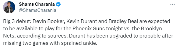 太阳三巨头首秀终于来了:杜兰特复出战篮网 比尔布克都可以出战