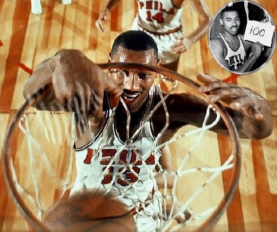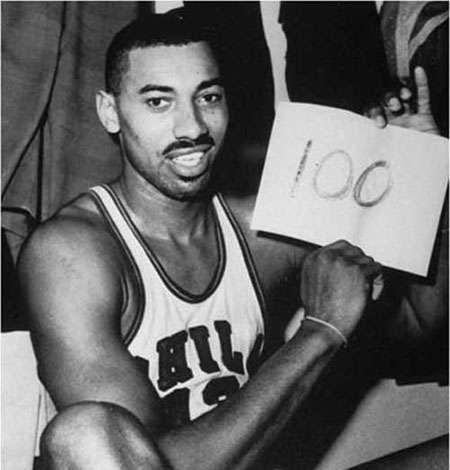 那场比赛还剩1分25秒钟时,看台上的球迷早已陷入痴狂状态,他们恨不得喊破喉咙,“把球传给威尔特!把球传给威尔特!”此时张伯伦已经得到了98分,只要再投中一个球,就能突破百分大关。比赛还剩46秒钟,张伯伦终于得到达至圆满的机会,他在篮下接球,跃起,灌篮,100分神迹就此问世,勇士队最终以169:147大胜。张伯伦疯狂秀场,连对手都被他彻底虏获,据说在100分诞生之际,尼克斯队的防守球员根本就没动。那场比赛,并没有电视直播,甚至纽约各大报纸的记者都没去采访,因为时值赛季末尾,他们也知道尼克斯队铁定输球,去了也是白跑一趟。奇怪的是,据统计现场观众只有4124人,可时隔多年之后,声称亲眼见证100分的人超过了10000人。赛后张伯伦在接受《HOOP》杂志采访时说:“上帝,这简直不可思议。我从未想到自己会在一场比赛中投那么多篮。”的确,他把比赛当成了投篮练习,加之后来队友也极力成全,技术统计上赫然写着:63投36中。不仅如此,张伯伦向来很烂的罚球在那个夜晚也有点不靠谱:32投28中——要知道,那个赛季他的罚球命中率是惨不忍睹的50.6%。还有更加不可思议的,据说比赛前一晚,张伯伦彻夜未归,在美女身上浪费了不少体力。较之于单场100分和场均50.4分,张伯伦蝉联篮板王这等小事似乎没有赘述的必要了。